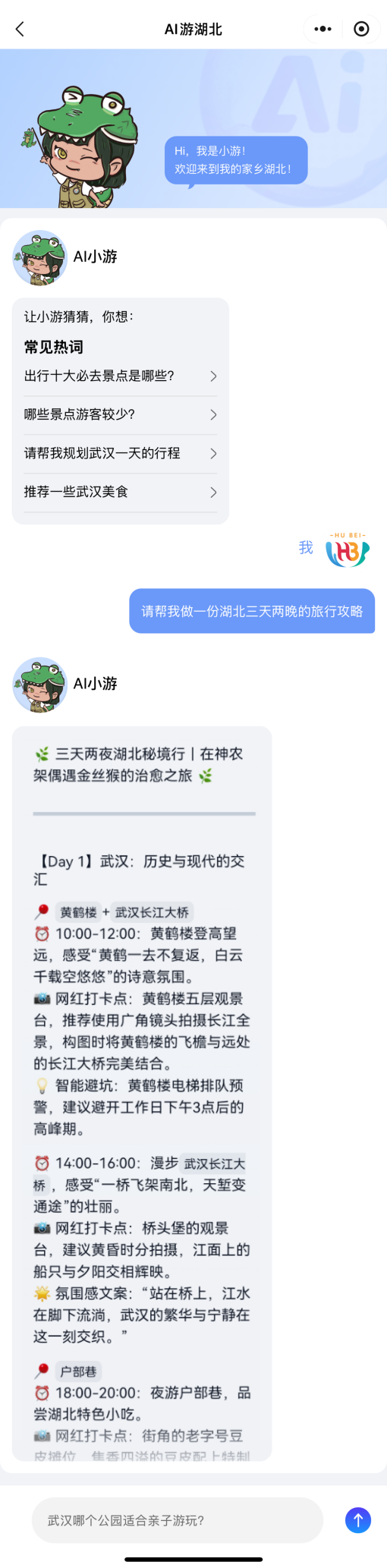 近日,數(shù)旅集團(tuán)游湖北平臺正式上線“AI游湖北”板塊,無論是行程規(guī)劃、景點(diǎn)介紹,還是實(shí)時天氣查詢、景區(qū)客流預(yù)警,都能輕松實(shí)現(xiàn)。為游客提供更加全面、便捷、智能的旅游服務(wù),進(jìn)一步推動數(shù)旅集團(tuán)在文旅領(lǐng)域的創(chuàng)新發(fā)展。