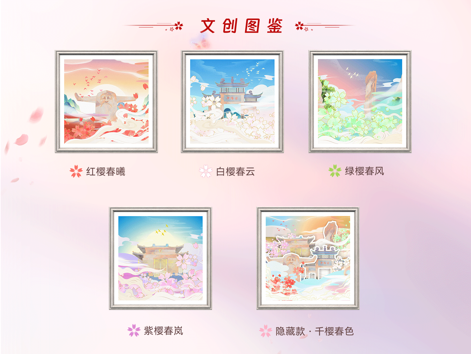 盲盒包含《紅櫻春曦》、《白櫻春云》、《綠櫻春風(fēng)》、《紫櫻春嵐》四款數(shù)字文創(chuàng),總計400000份。購齊此四款者有機會領(lǐng)取隱藏款《千櫻春色》(限量6000份),隱藏款特定編號的用戶可獲得景區(qū)門票權(quán)益大禮包。